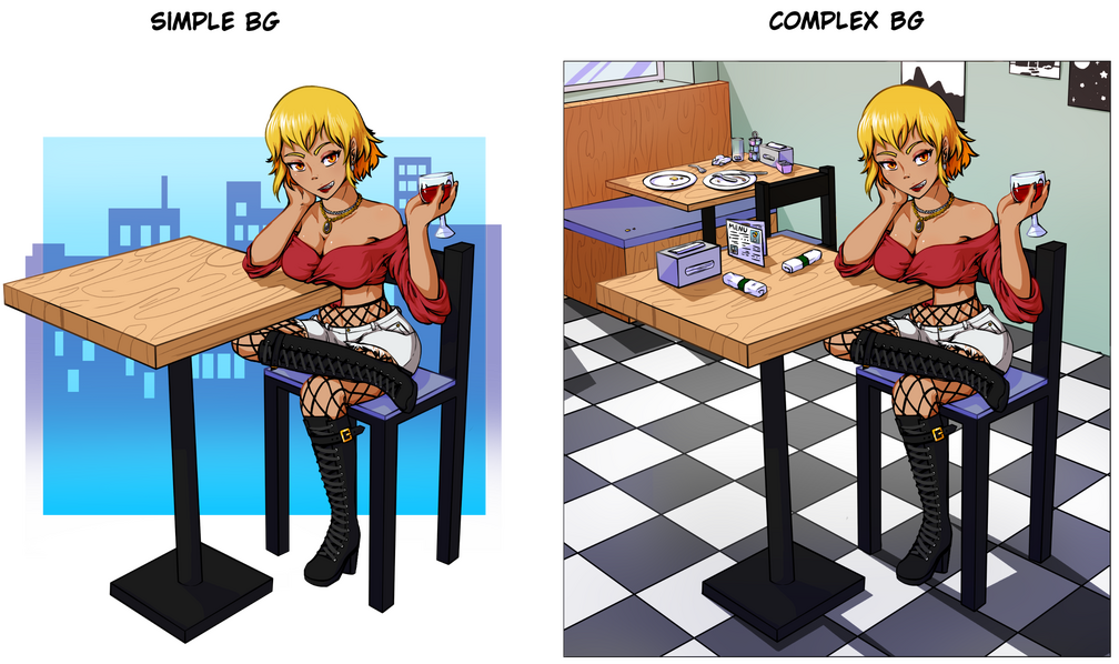 | single color / transparent bg: free | Full Scene/complex BG: $30+ |
